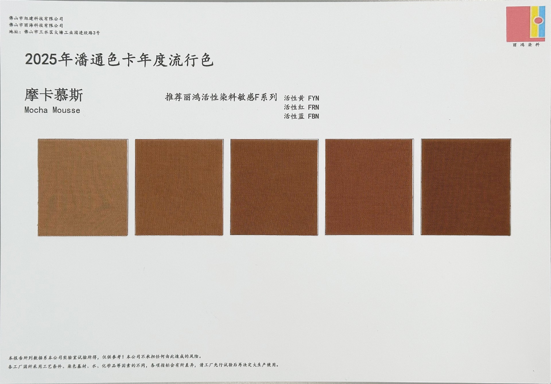 靚源科技已成功試染2025 流行色「摩卡慕斯」,并推出全新「敏感色系列」!更優(yōu)配伍性、染色工藝更寬容、染色效果更穩(wěn)定,讓您的面料如摩卡般絲滑顯色,輕松駕馭時(shí)尚風(fēng)潮!